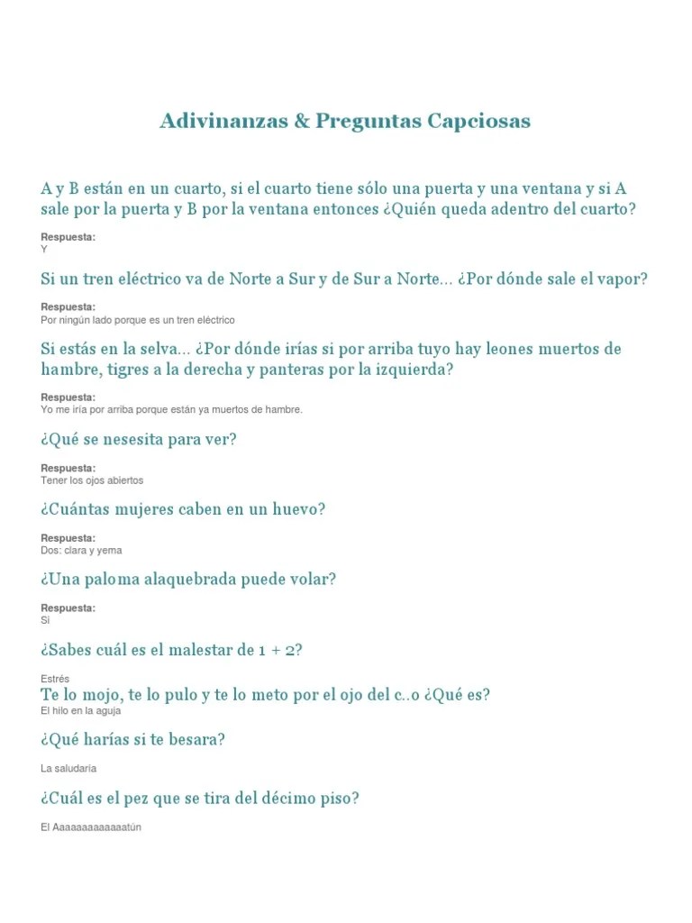 Descubre +110 preguntas capciosas con respuestas divertidas y originales. Estos acertijos o preguntas con trampa son . Te damos 45 preguntas capciosas con respuestas difíciles y divertidas, que te harán pensar o te confundirán. Ver más ideas sobre acertijos, acertijos mentales, reto mental.